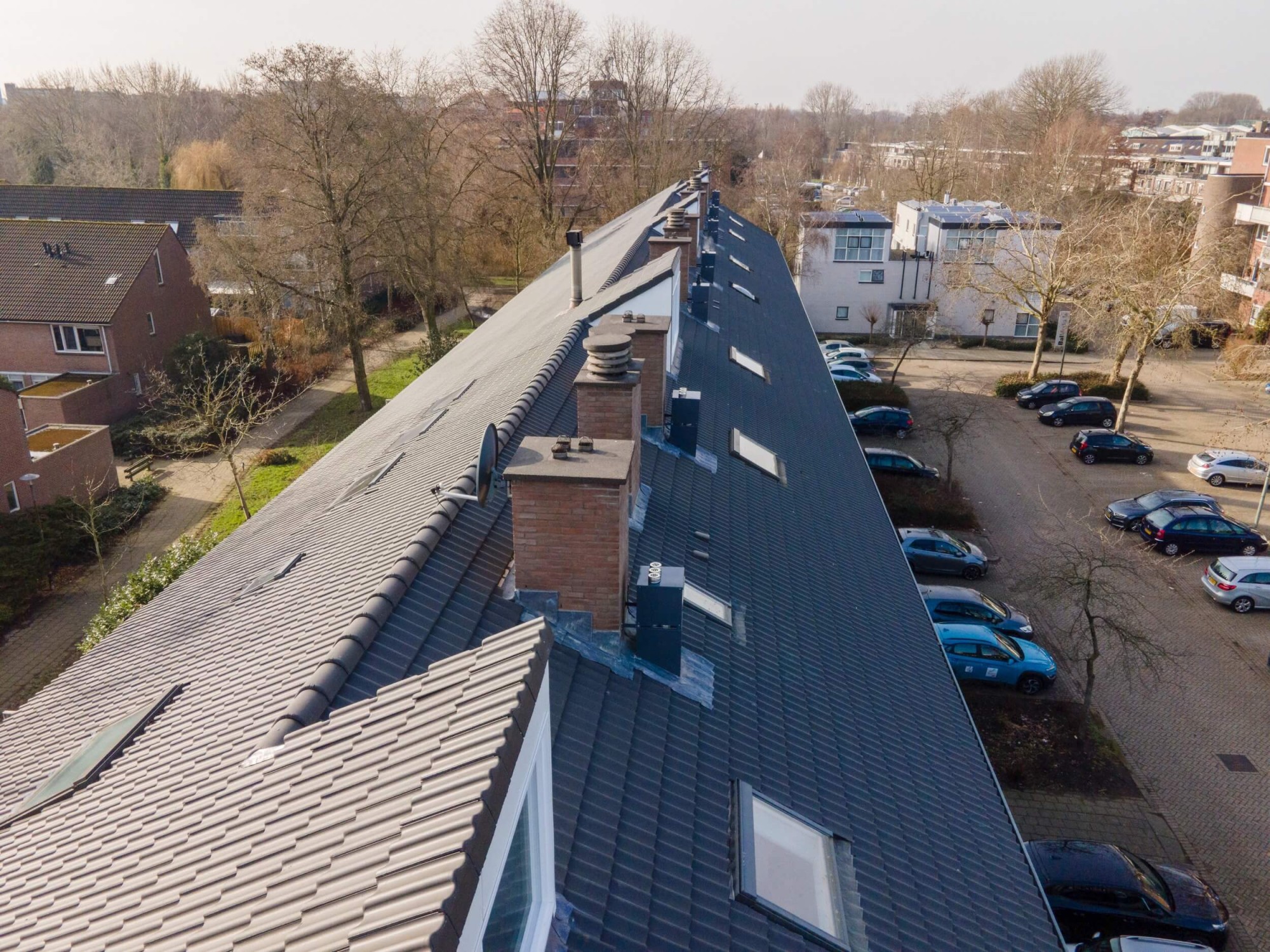 De bestaande dakpannen, inclusief tengels en panlatten, zijn verwijderd en vervangen door een nieuwe dakopbouw met meerlaagse folie, nieuwe tengels, panlatten en dakpannen. Daarnaast zijn de schoorstenen voorzien van nieuw lood- en voegwerk. Voor een duurzame en waterdichte afwerking zijn de bovenzijden van de schoorstenen gecoat en zijn de weerszijden geïmpregneerd.